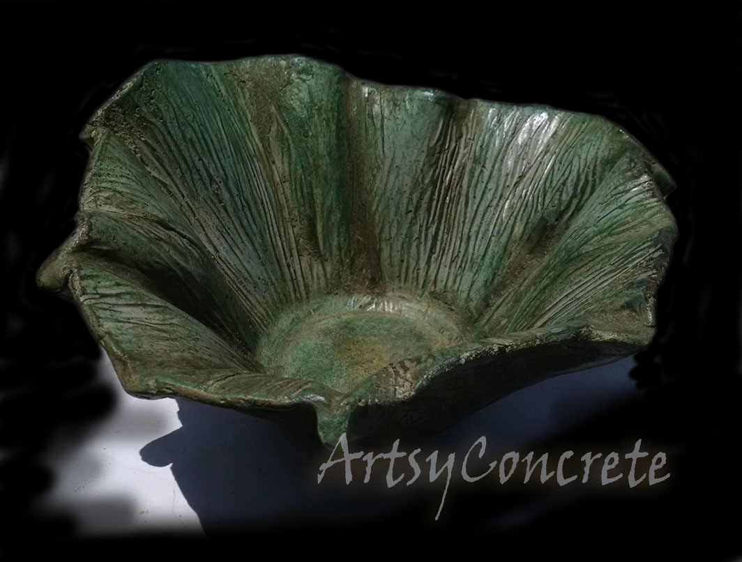 This artsy bowl was handcrafted in high density concrete and finished in coffee and weather copper concrete dye. Size: 9″ dia x 3 3/4″ H.