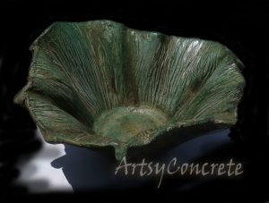 One of my favorites. This hand crafted (no mold) beautiful home decor concrete bowl is finished in coffee and weather copper concrete dye. More of the weathered copper gave this piece a greenish blue tint. Size: 11″ dia x 5″ H.